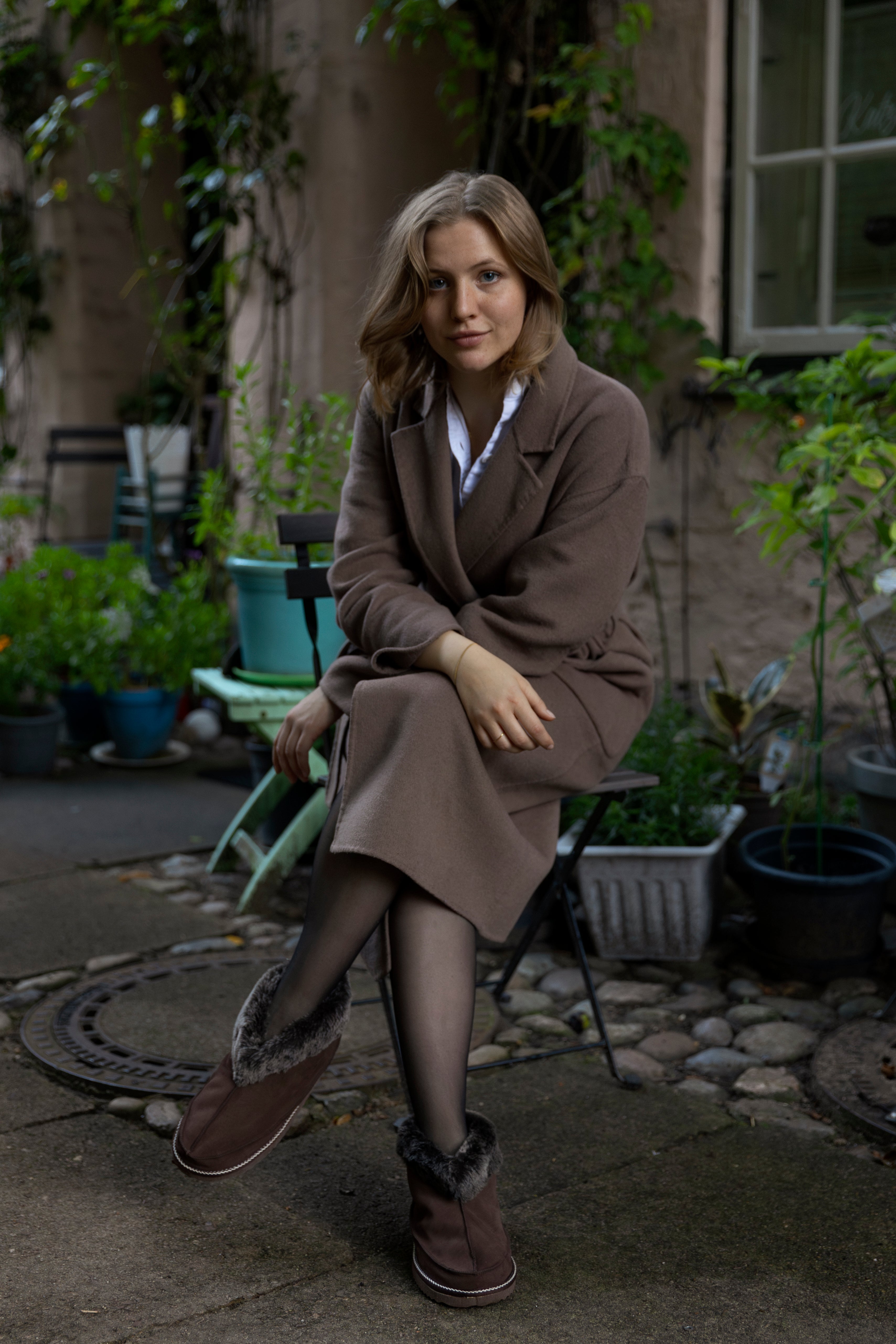 Person wearing brown suede shoes with white fuzzy lining, sitting on a stone surface.